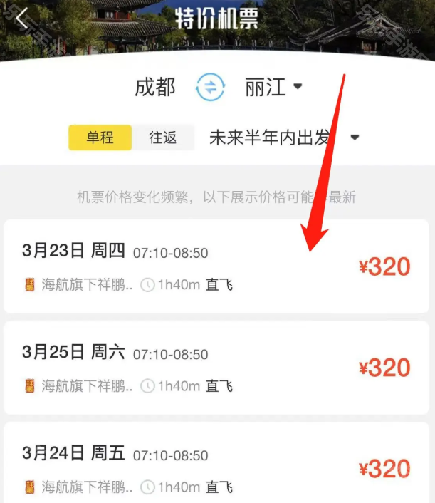 4、最后app会给我们显示半年内单程和往返机票的价格,之后按需选择即可