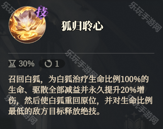 分析:每3回合可使白狐满血满状态回归,并永久增伤+施放绝技,虽然有吟唱但时间不长,且白狐天赋可在吟唱期间反击敌人,是一个集无消耗、治疗、驱散、增益、伤害于一体的强力绝技。