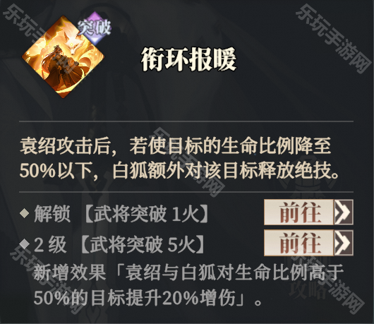 袁绍攻击后,只要目标血量低于50%,白狐就能触发1次无消耗额外绝技进行追击,5火时袁绍和白狐对血量高于50%的目标提升20%增伤。