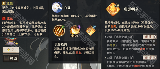 袁绍的核心技能,开场时召唤白狐,优先后排空位(后排>中排>前排),白狐继承袁绍最高140%攻击力和100%其他属性,升星提高继承攻击比例和白狐绝技流血层数。