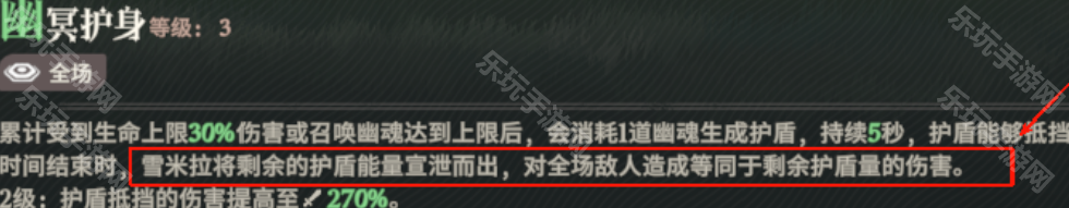 戴蒙将敌人的生命值转化为自身护盾。每隔一段时间,守护灵对周围敌人真实伤害,并将实际伤害量转化为戴蒙的护盾。(护盾+玩偶真伤)