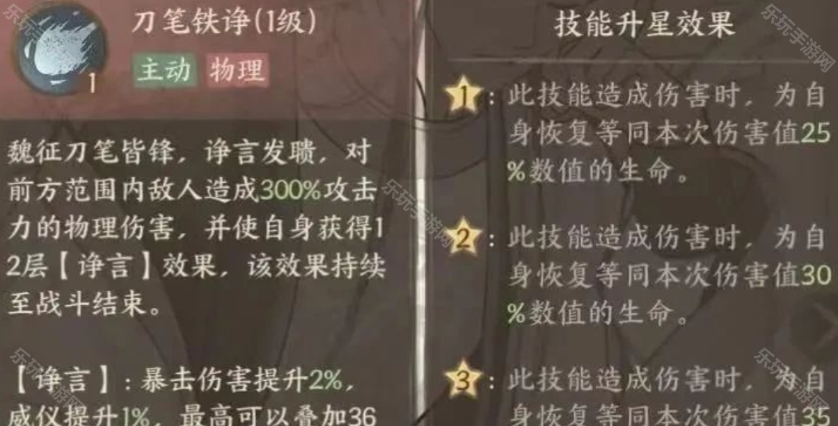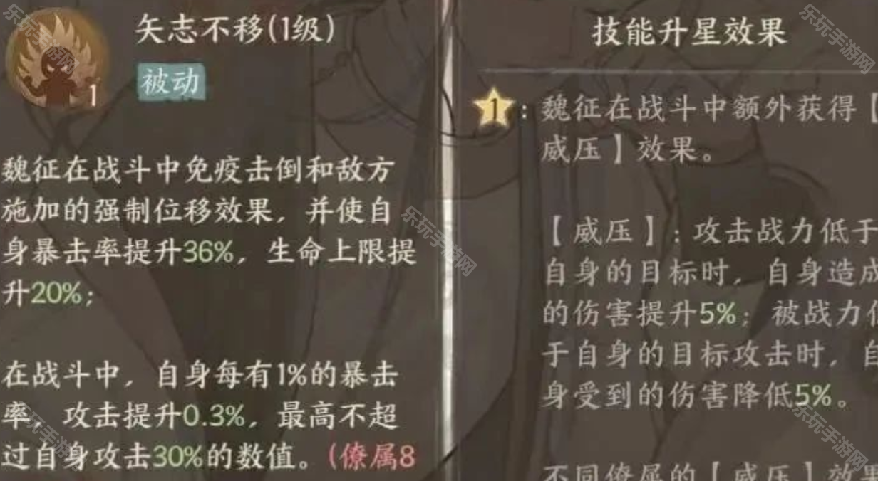 核心技能之一,免疫强制位移和击倒,不怕关羽,不怕宁姚,作为近战僚属,占据这俩基本能站住脚了,暴击率提升=攻击力提升,而且还给自己加生命上限+暴击率,星级效果十分强力,面对战力比自己低的僚属伤害额外提升,被战力高的攻击伤害减免增加,不管是打低战还是越战都是神技。